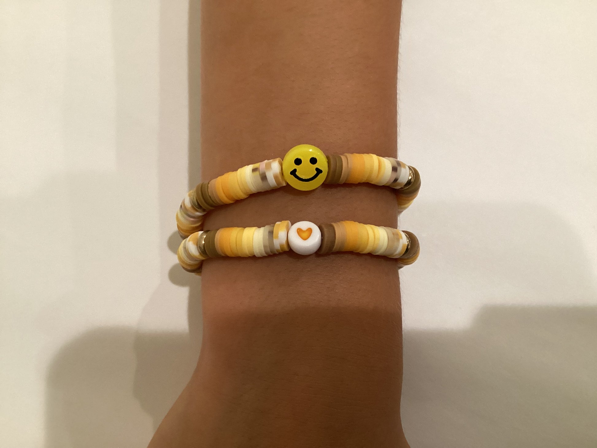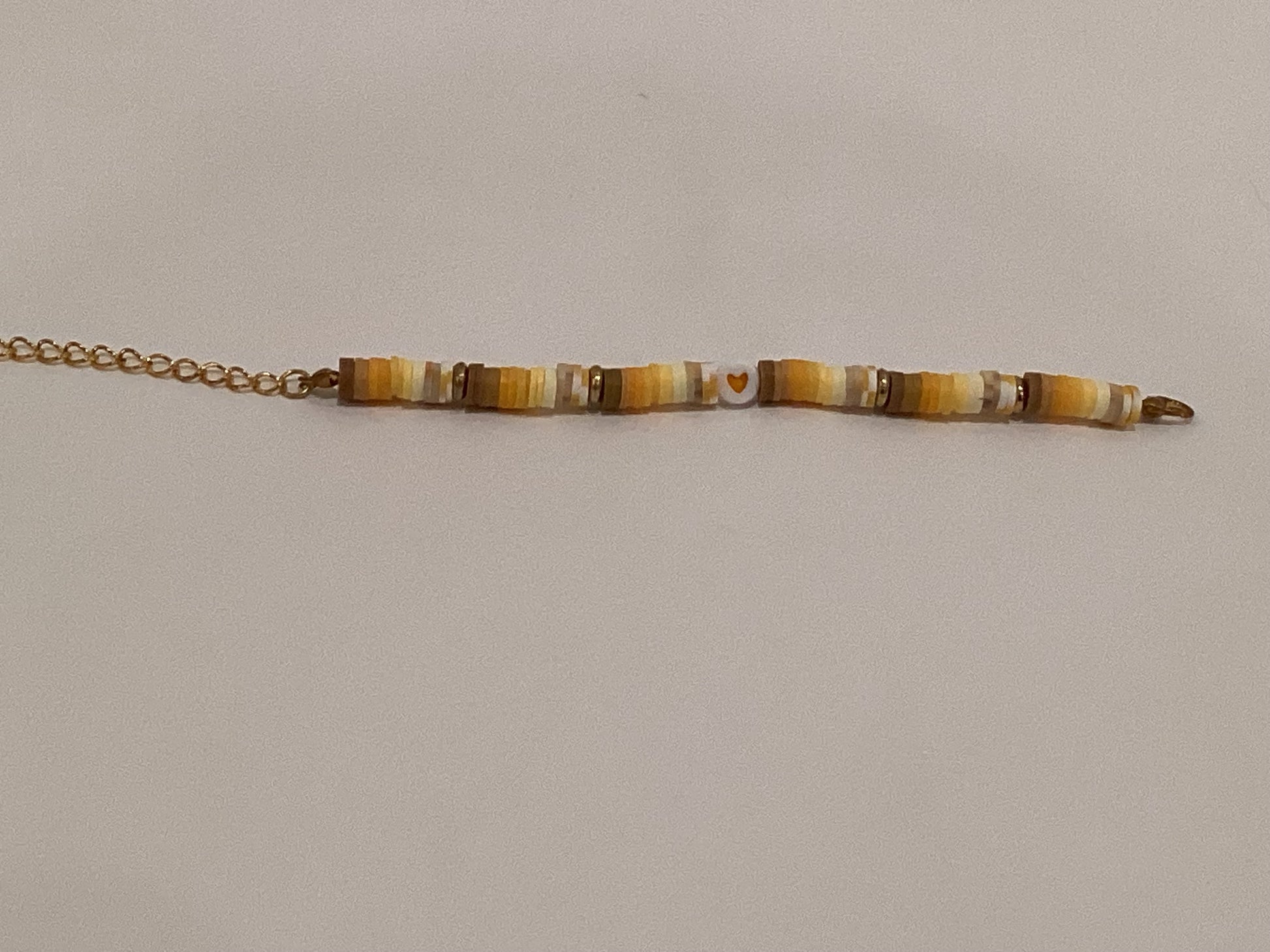 Honey and Brown Sugar is a gold, yellow, and brown clay bead bracelet. This bracelet has an adjustable chain for versatile and a central yellow charm in the middle to highlight its theme. Honey and Brown Sugar measures 6 3/4 to 8 3/4 inches in length.
