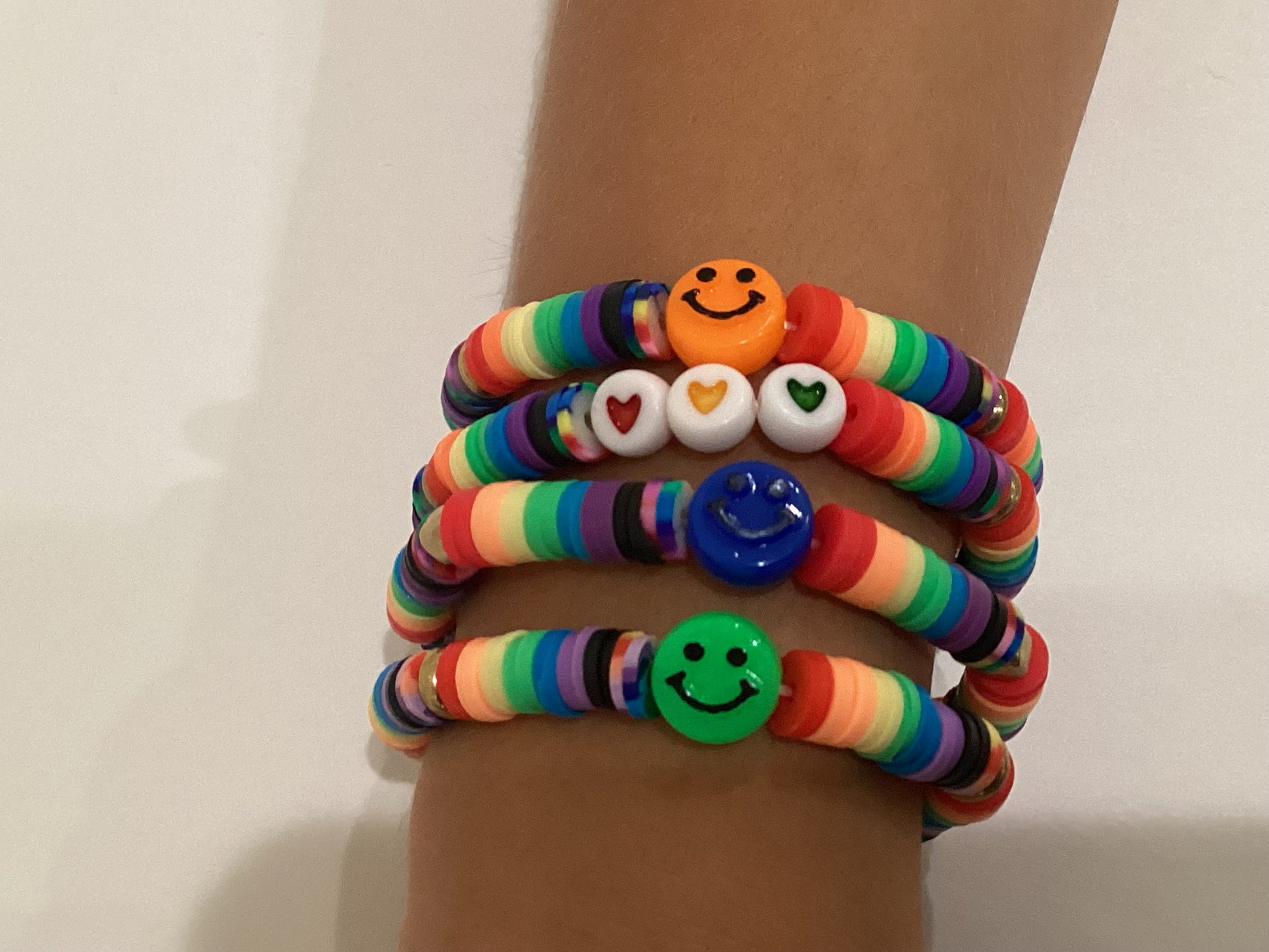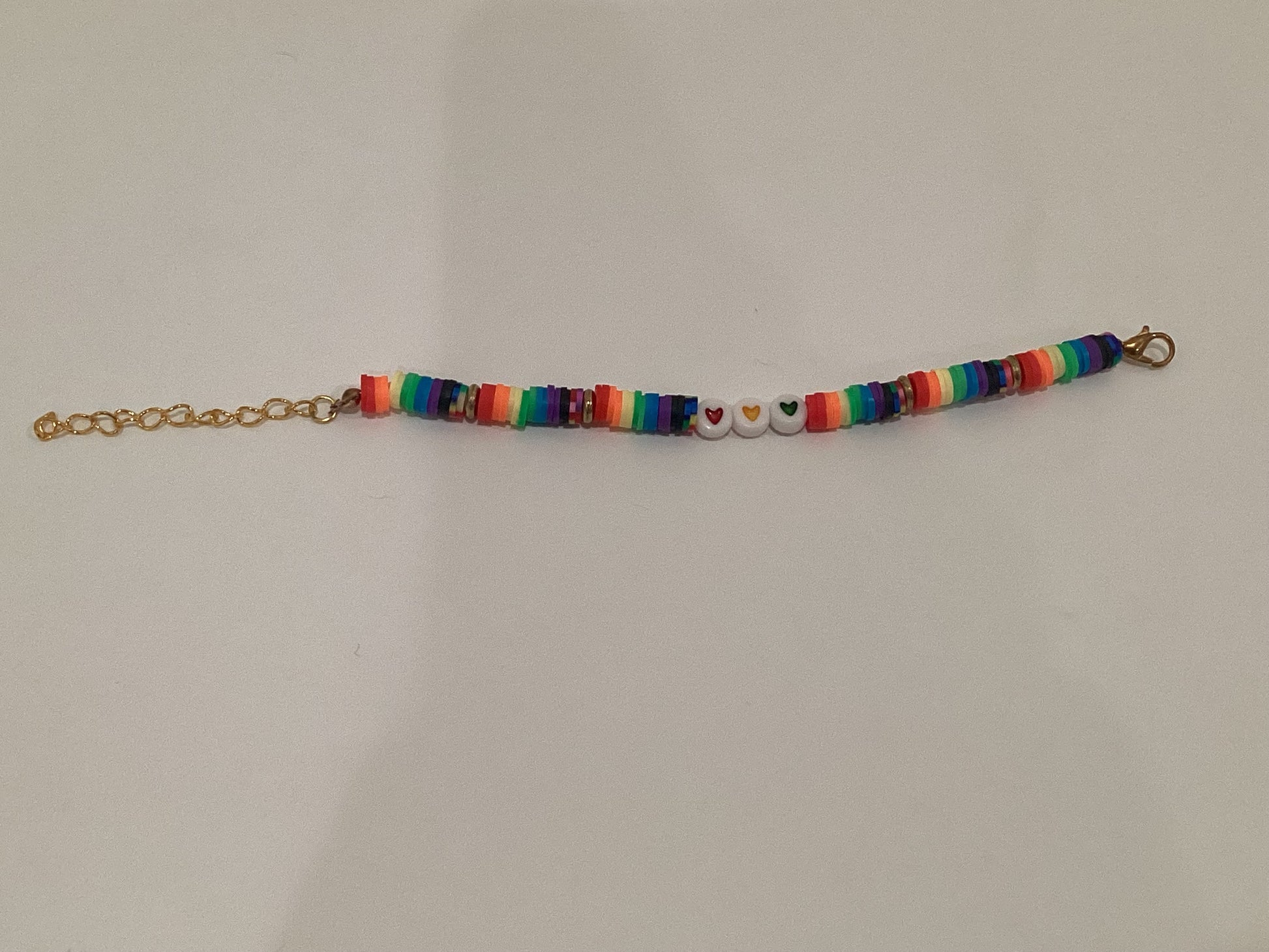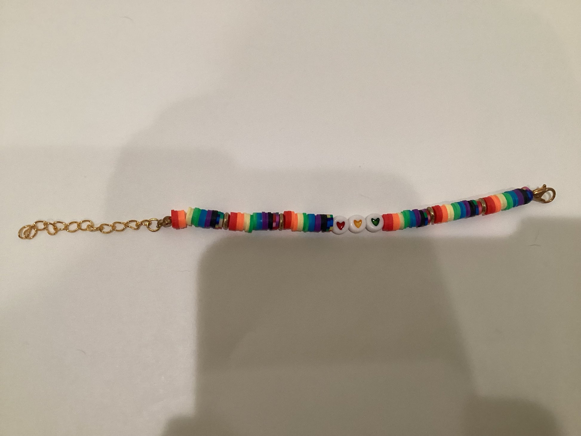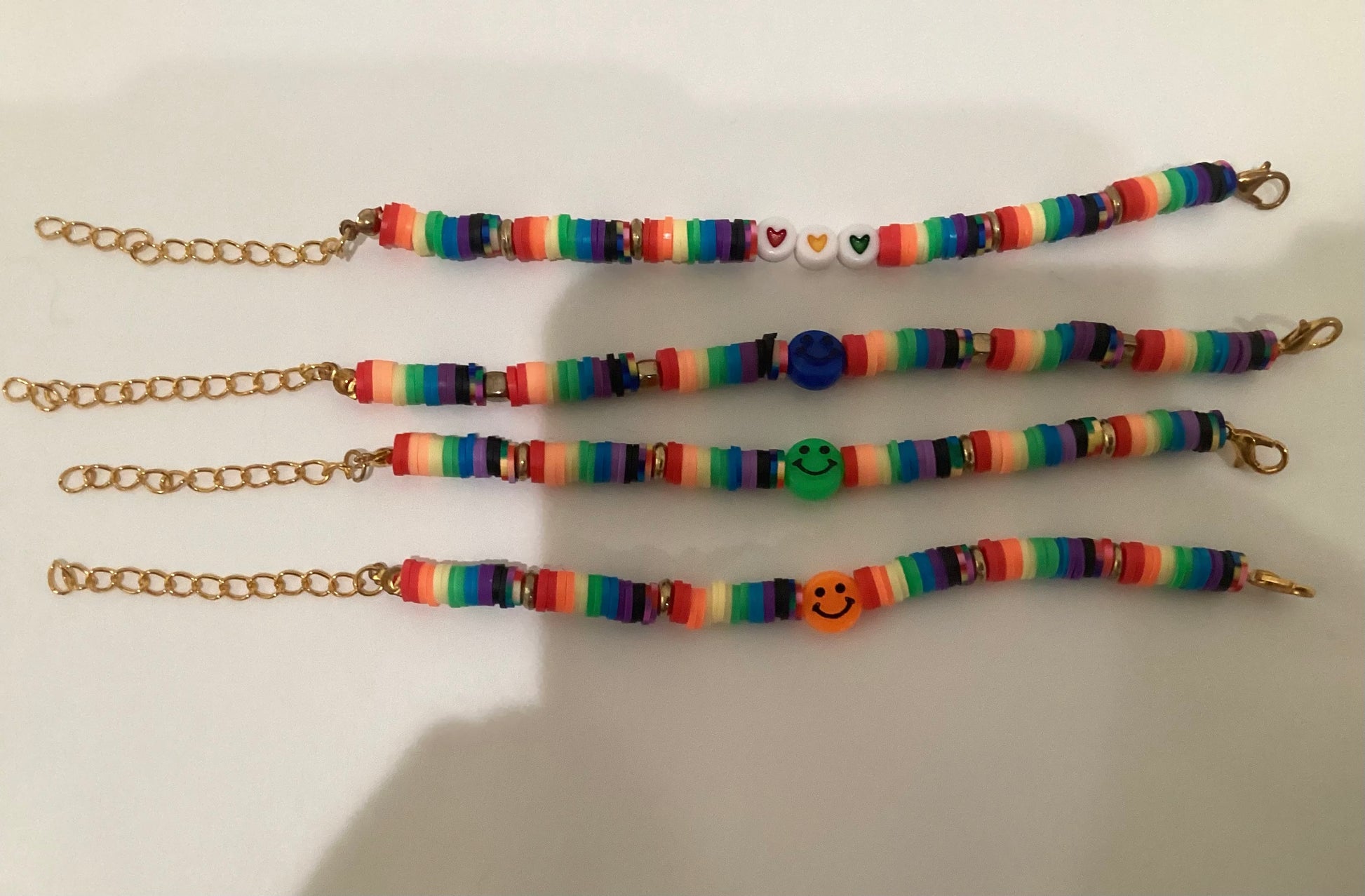 Over the Rainbow (Bright) is a red, orange, yellow, green, blue, and purple clay bead bracelet. This bracelet has an adjustable chain for a versatile fit and a central neon charm in the middle to highlight its theme. Over the Rainbow (Bright) measures 6 1/2 to 8 1/2 inches in length.